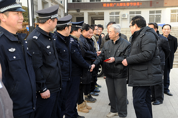 在学院办公室、保卫处、后勤保障处负责人的陪同下,左晓民、魏书堂一行先后前往各处门卫、教学楼、公寓、图书馆、体育场值班室,后勤保障处公寓服务中心、水电班,保卫处警务室、监控室等一线岗位,与工作人员亲切握手,代表学校党政向大家拜年,对坚守在工作岗位上的工作人员表示感谢,并亲手送上节日慰问品。在每一个慰问地点,校领导都详细询问了各部门的工作情况,要求每位工作人员在春节期间一定要把安全稳定放在首位,保证全校师生度过一个温暖、祥和的春节。