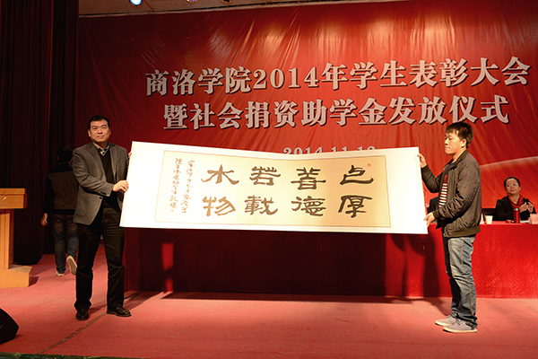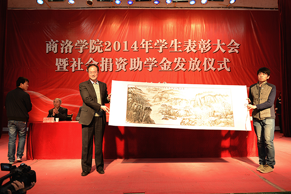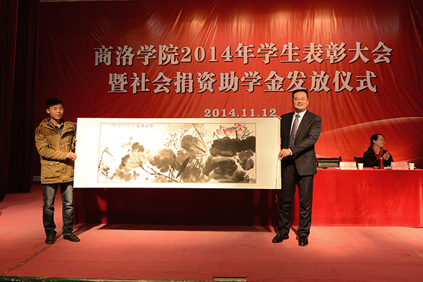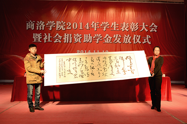 为了答谢4家企业对我校学生的无私资助,受助学生代表现场向商洛供电局、中国邮政商洛分公司、中国联通商洛分公司和中国电信商洛分公司敬赠了4幅自己创作的书画作品。学生王聪、张思思分别代表受表彰的先进个人和受资助学生作了大会发言。