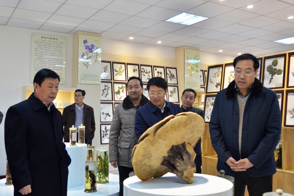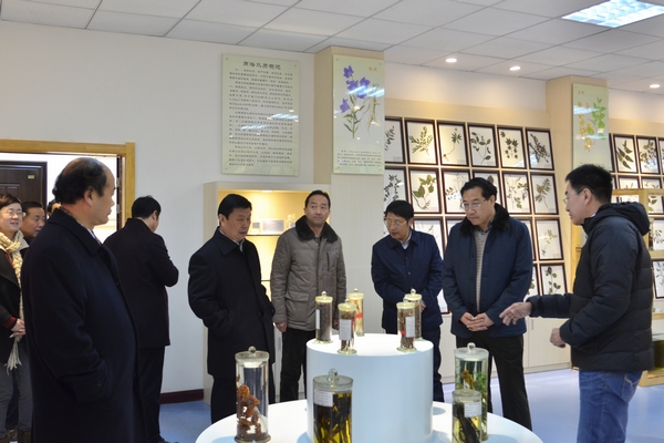黄思光一行深入我校秦岭植物标本陈列室,参观了展室陈列的312种腊叶、近百种浸制标本、480种中药饮片、商麦育种标本、秦岭野生灵芝以及桔梗药酒等各种研制产品,并与秦岭植物研究团队人员进行了亲切交流。