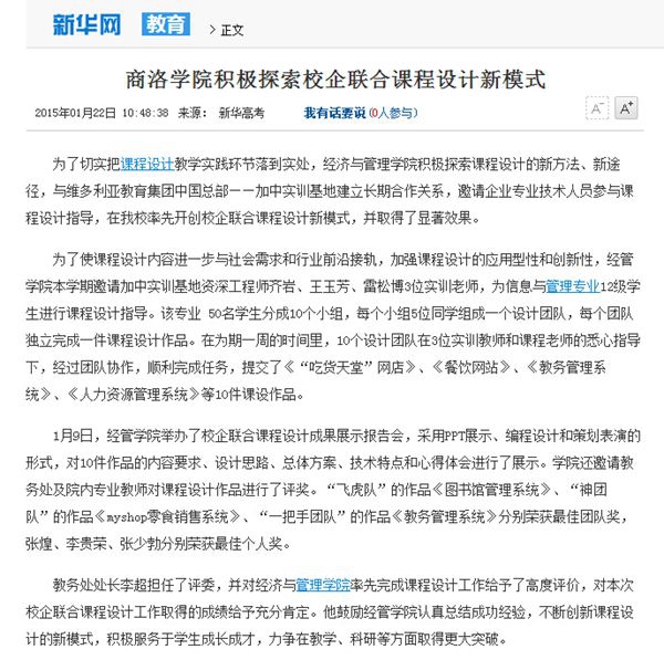 近日,我校校园网对经济与管理学院与维多利亚教育集团中国总部——加中实训基地开创校企联合课程设计新模式进行了报道。1月22日,经宣传部推荐,新华网教育频道以《商洛学院积极探索校企联合课程设计新模式》进行了报道。原文链接如下: