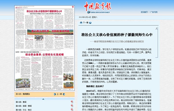2月14日,《中国教育报》第4版以《将社会主义核心价值观的种子播撒到师生心中》为题,对我校培育和践行社会主义核心价值观宣讲活动进行了报道。该文一经刊发,人民网、新华网、中国网、中国日报网、环球网、中国青年网、网易、腾讯网等全国各大媒体纷纷转载,在社会上引起了强烈反响。