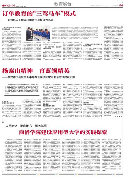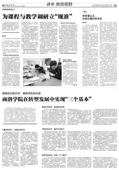 4月21日,《中国教育报》在第4版《教育展台》专题版,刊发了校党委书记张景书、校长刘建林撰写的文章《商洛学院建设应用型大学的实践探索》,专题报道了我校的办学目标与定位、建设应用型大学的实践与探索、办学成果与办学特色;4月22日,《中国教育报》在第10版《课程周刊》专题版,刊发了《商洛学院在转型发展中实现“三个基本”》的专题文章,报道了我校在转型时期教育教学改革的成果,备受社会关注。