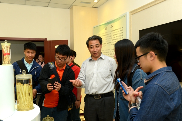 在生物医药与食品工程学院师生代表的陪同下,台湾师生饶有兴致地参观了秦岭植物标本陈列室,现场品尝了生物医药与食品工程学院自酿的山茱萸葡萄酒,称有家乡桑葚果汁的味道。他们对秦岭丰富的生物资源尤其是中药资源兴趣浓厚,纷纷拍照留念。