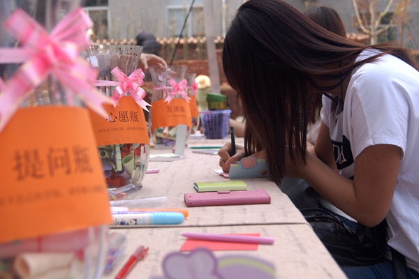 人文学院组织的“传递正能量,将爱进行到底”漂流瓶活动在我校学生中引起了广泛关注。参与活动的同学写下了寄托祝愿的心愿瓶、诉说恼烦的提问瓶、分享感动的温暖瓶,由其他同学来帮助他们实现心愿,解答疑问,一起分享爱的感动。同学们在活动中通过一句句温暖、为善、感恩的话,化解生活中人事冲突,释放因学习、工作、人际等带来的压力与负性情绪,学会表达、学会尊重、学会关心他人。在快乐中释放了压力,在温暖中传递着正能量。活动共计收到各类祝福、心愿卡片210余个,达成各类提问和心愿180余个,参与人次达到400余人。