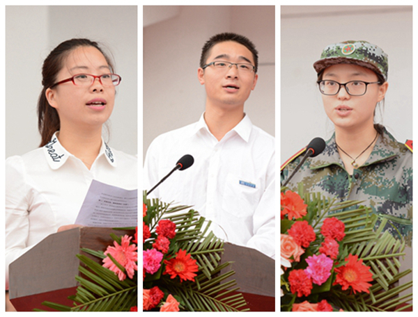 化学工程与现代材料学院教师曹宝月博士,2013级经济与管理学院学生鱼庆彬,2015级生物医药与食品工程学院学生田梦婷分别代表学校教师、在校生和新生作了发言。