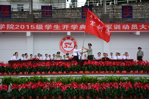 骄骄学子,今登堂明入室,星夜兼程圆好梦;巍巍黉门,才送往又迎来,躬耕不辍育国魂。9月8日,我校隆重举行2015级学生开学典礼暨军训动员大会。校领导张景书、刘建林、王思怀、魏书堂、彭虎军、范新会、刘宝盈,解放军西安政治学院党委常委、院务部部长邱仕伟大校,解放军西安政治学院政治部副主任张新军大校,解放军西安政治学院军事系教授、学生军训团团长刘京生大校,商洛市人民政府副秘书长宋奇志出席了大会。校党委书记张景书向承训教官授2015级学生军训团团旗,校党委副书记、校长刘建林作了重要讲话。大会由校党委副书记彭虎军主持。各院部党政负责人、各职能部门负责人与2015级新生参加了大会。