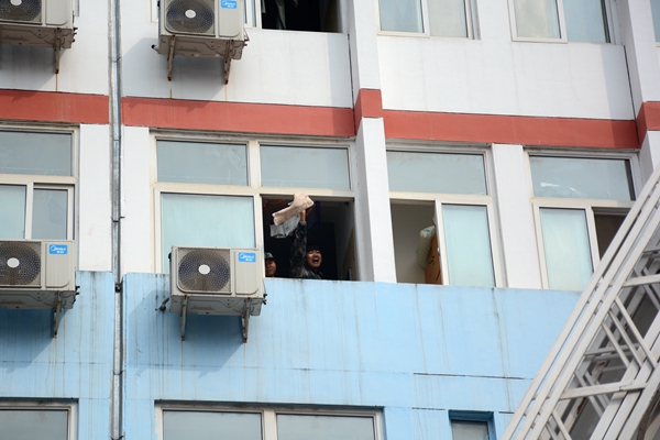 学生们从“失火”的楼道撤离