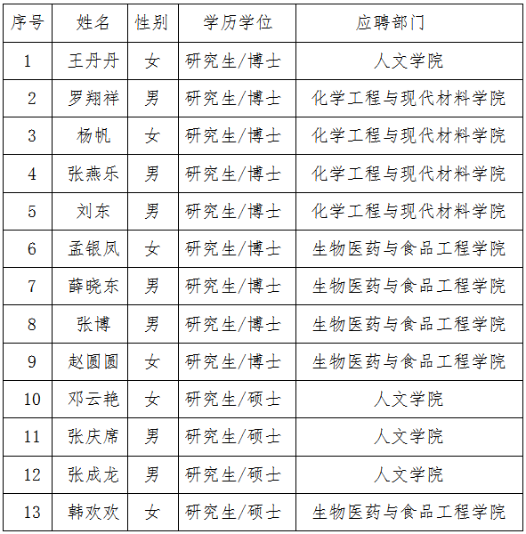 商洛学院2020年第六批拟招聘人员名单(13人)