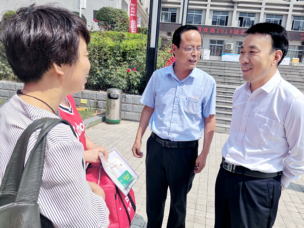 9月2日,天高气爽,微风徐徐,我校2019级新同学陆续来校报到。学校迎新工作部门早早准备到位,师生按照迎新分工,展开热情的双臂忙碌而有序地迎接新生及家长到来。下午,党委书记龙治刚、校长范新会、党委副书记彭虎军、副校长刘勇也到迎新现场亲切看望新生及家长,为他们送上关心与关爱。