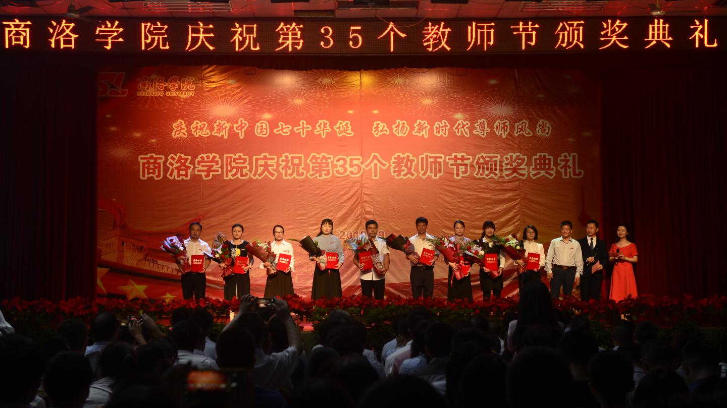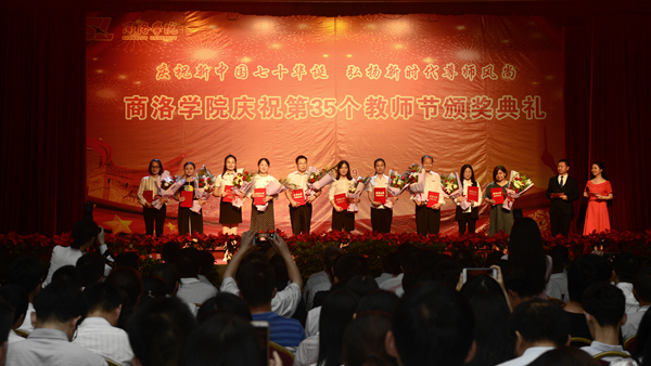 龙治刚代表学校党委和行政领导班子祝福全体教职工节日快乐,向受到表彰的教师们表示祝贺,对奋战在教学科研、管理服务、后勤安全保障等工作岗位上为学校事业发展付出心血汗水的教职员工表示感谢。他在致辞中指出,过去的一年里,全体教职员工团结一心、砥砺奋进,坚持立德树人根本任务,聚焦办学实力与核心竞争力水平提升,在教学科研、管理服务等各项工作中取得了可喜的成绩,今天获得表彰的教师,就是全体教师和教育工作者潜心育人、默默奉献、追求真理、勇于创新的缩影。他表示,再过20天,就是中华人民共和国成立70周年纪念日,回顾历史、我们心潮澎湃,展望未来、我们壮志满怀,希望全体教职员工不负习近平总书记的重托,不忘师者初心,牢记育人使命,大力弘扬“自强不息,止于至善”的商洛学院精神,同舟共济、齐心协力,争做“四有好老师”,为建设一流学院添砖加瓦,为实现中华民族伟大复兴培养有用人才。