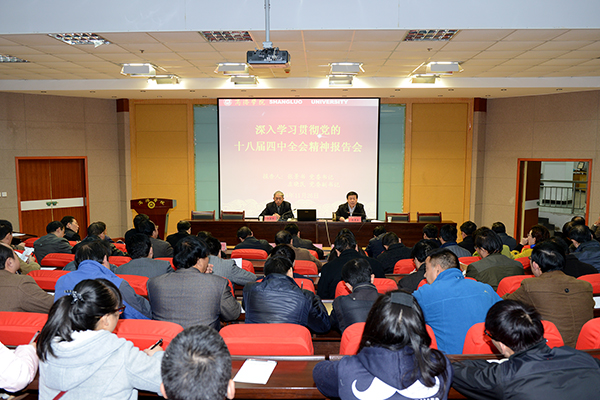 11月26日,我校举办深入学习贯彻党的十八届四中全会精神报告会。校党委书记张景书做了学习十八届四中全会精神辅导报告。张景书强调,全校各级党组织要以高度的政治责任感和历史使命感,切实抓好全会精神的学习宣传贯彻工作,结合学校实际,以依法治教、依法办学为重点,抓好全会精神的落实。党委副书记左晓民主持报告会,并就依法治国方略的背景、体系做了解读。纪委书记王思怀、副校长魏书堂,全校科级以上领导干部和学生干部听取了报告